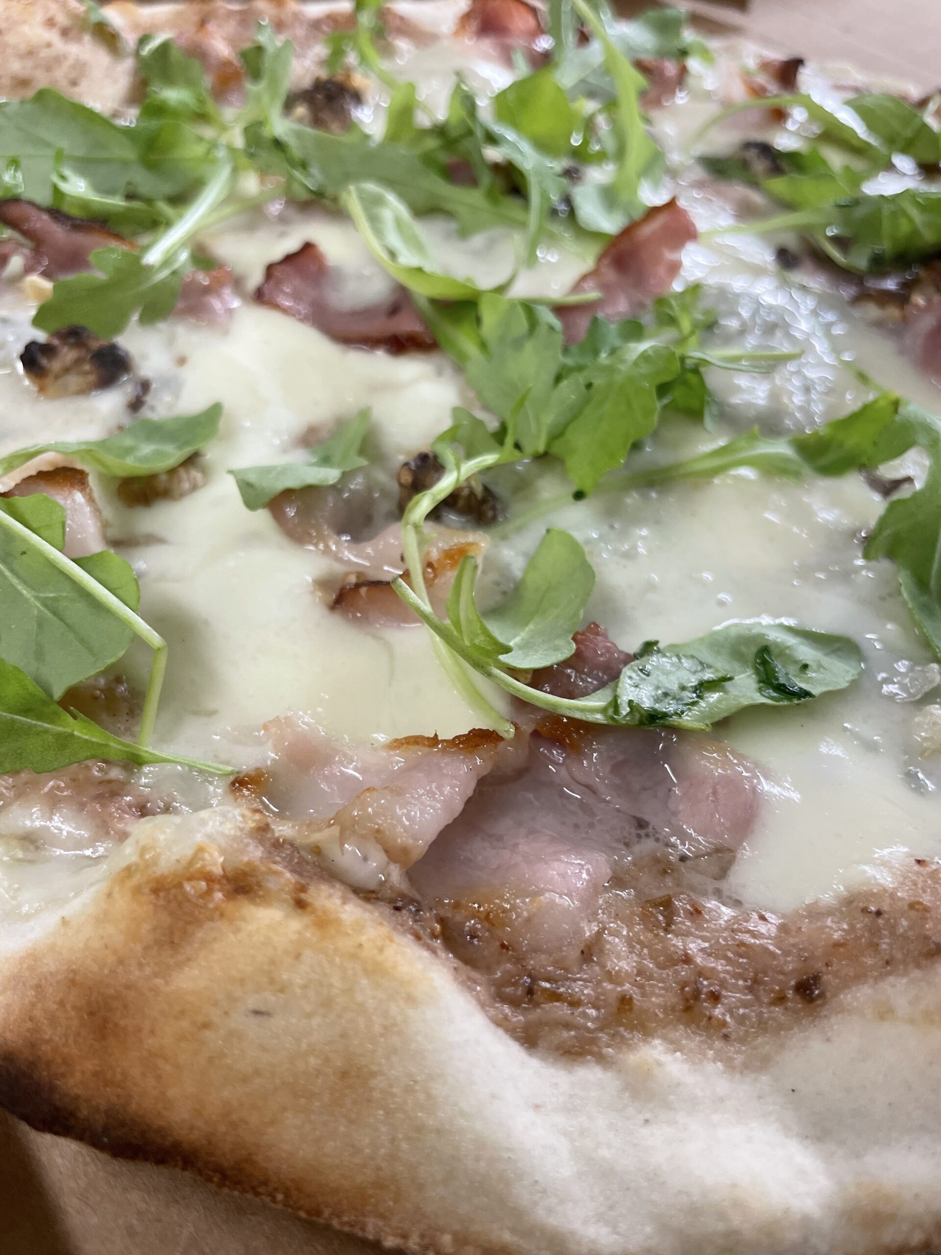 Base crème, mozzarella fior di latte, fontina ou chèvre mi-frais de Creney (en saison), poitrine fumée, miel, noix, pousses d’épinards -